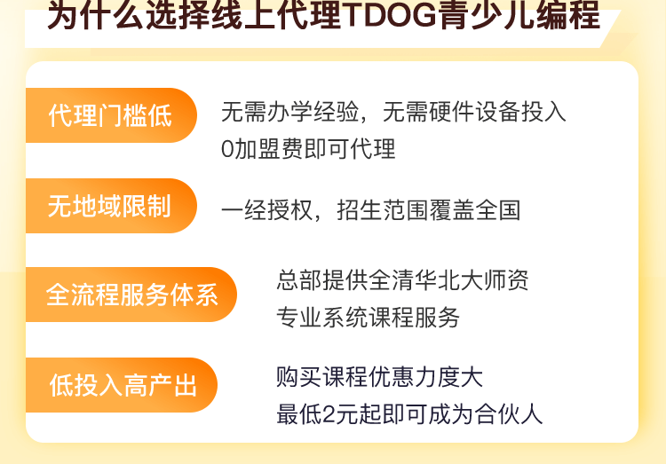 tdog青少儿编程在线教育项目,是由北京厦门企业商会参与发起,多位清华大学毕业团队共同创办的国内领先的少儿编程公司。该项目已获得中宣部学习强国、央视频、新华社app三大国家权威机构合作认可(国内首家编程机构)。授课师资全部来自清华大学和北京大学,完全值得信赖。现面向全国招募合作人,共同开启人工智能编程事业,0元加盟,效益可期。
