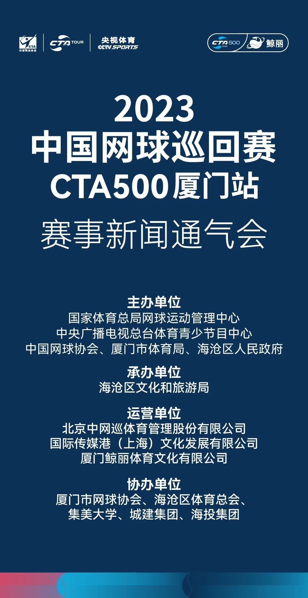 海沧区文化和旅游局副局长曾涛、海沧区体育总会会长周呈俊、中巡赛cta500厦门站赛事监督冯超、北京厦门企业商会副会长、厦门鲸丽体育文化有限公司董事长陈荣丽等领导和嘉宾出席通气会。